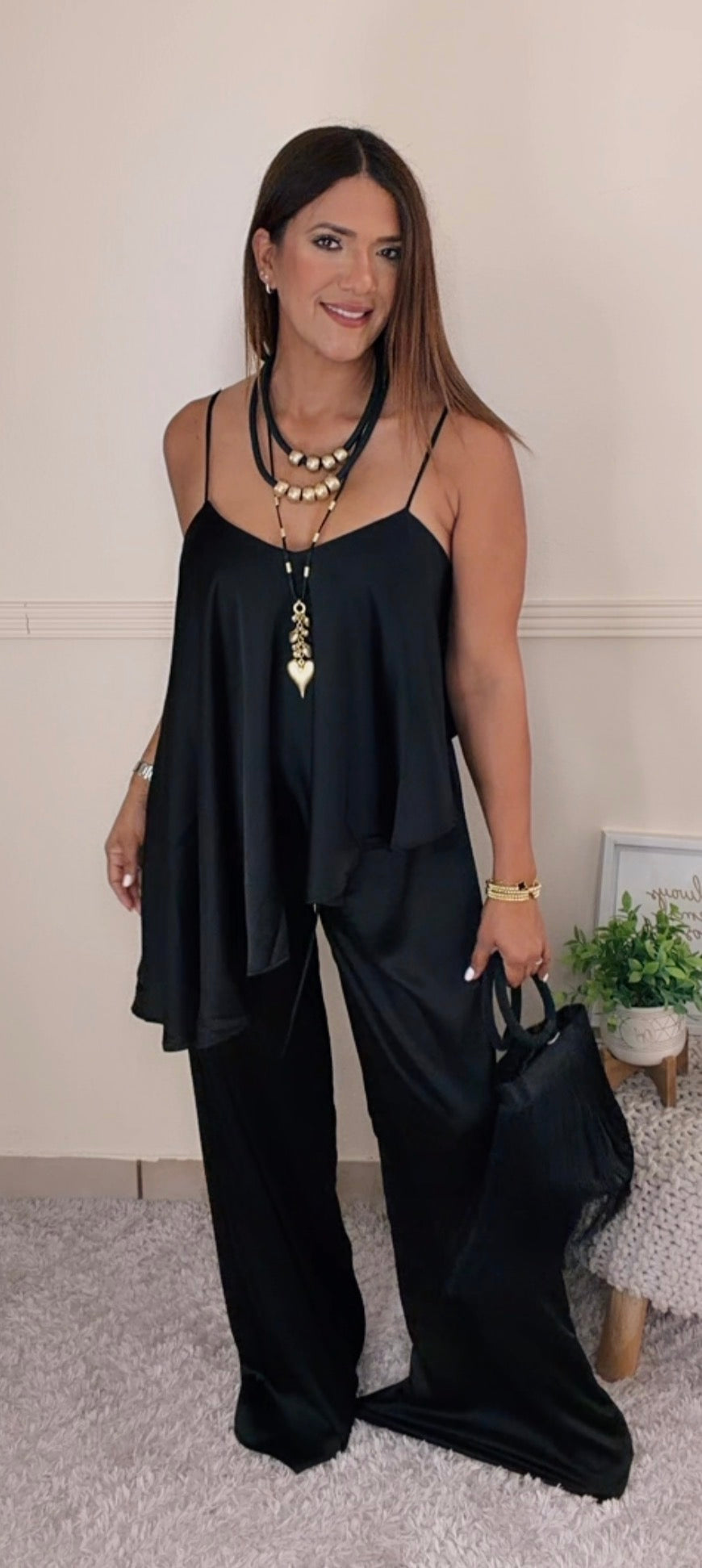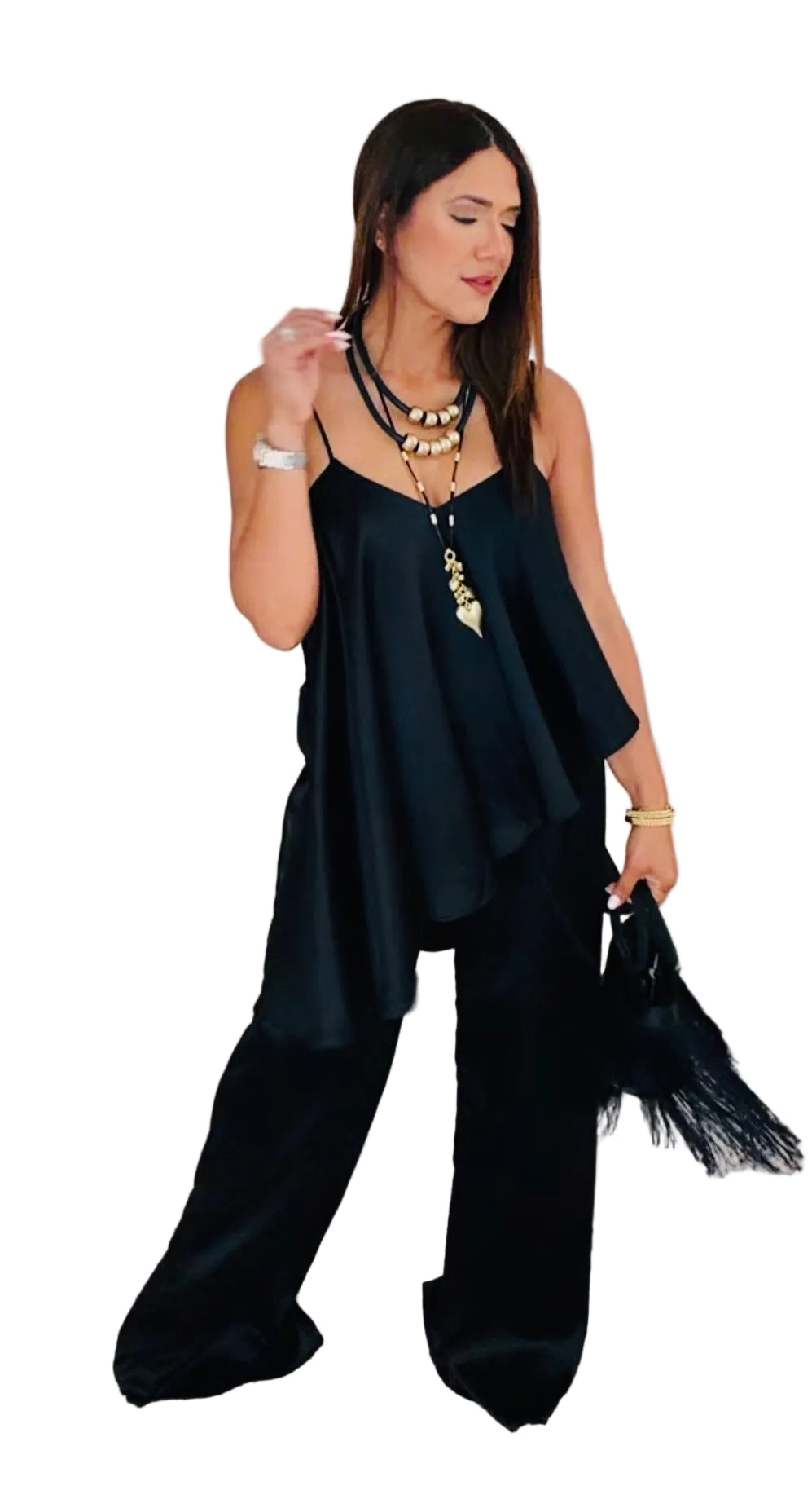 Set elegante en tela tipo satÃn con caÃda suave y ligera. Top asimétrico con espalda descubierta y ajuste en la parte posterior que estiliza la silueta. Pantalón wide leg fluido que alarga visualmente.